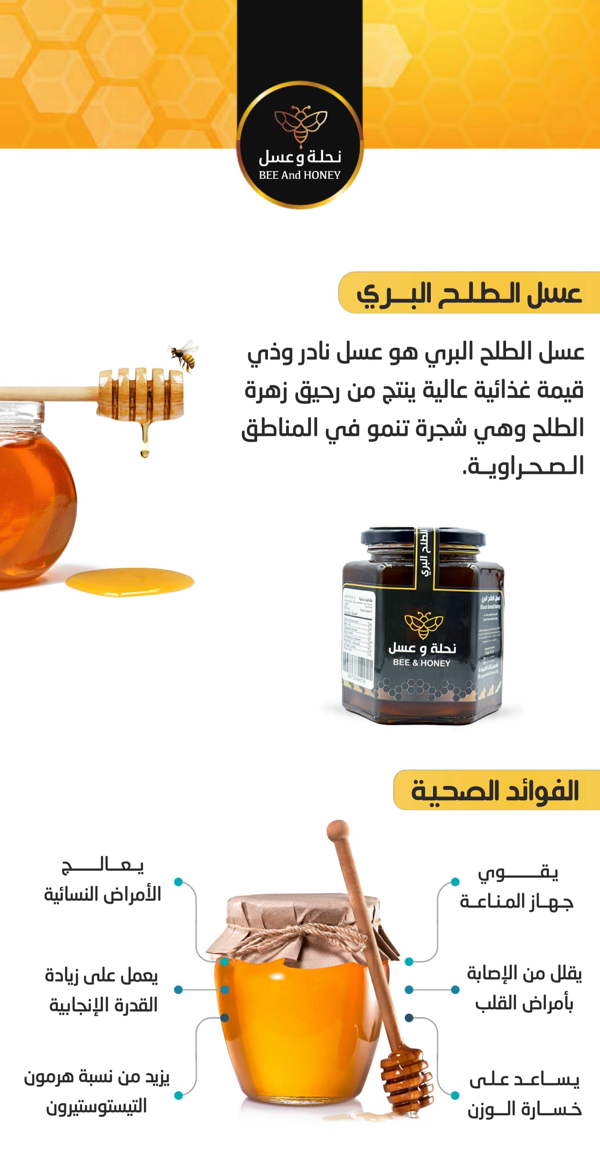 عسل الطلح البري يتميز بكونه عسلًا طبيعيًا نقيًا يُستخلص بعناية من رحيق أزهار شجرة الطلح الصحراوية. يمتاز بقيمته الغذائية العالية ولونه الداكن الذي يعكس أصالته وجودة مكوناته.
